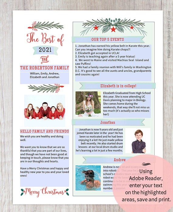 Year In Review Christmas Newsletter Template In Pdf For Print 4 Photo Entries Greenery Layout 3 Diy Adobe Reader Required