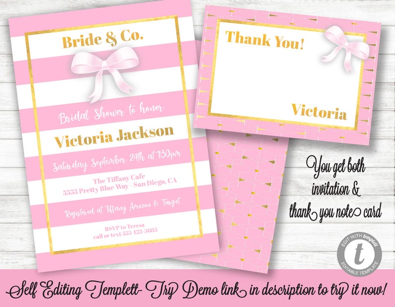 Bride Co Bridal Shower Invitation And Thank You Note Card Template Printable Invite Instant Download Editable Text Tiffany Pink Gold