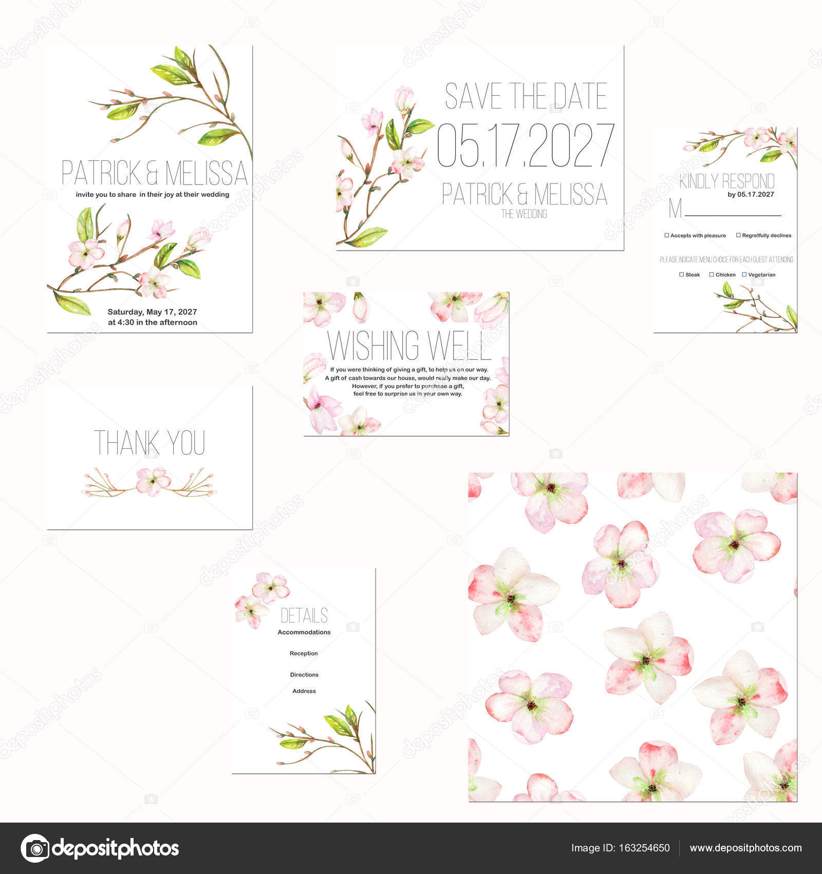 Template Cards Set With Watercolor Spring Pink Apple Tree