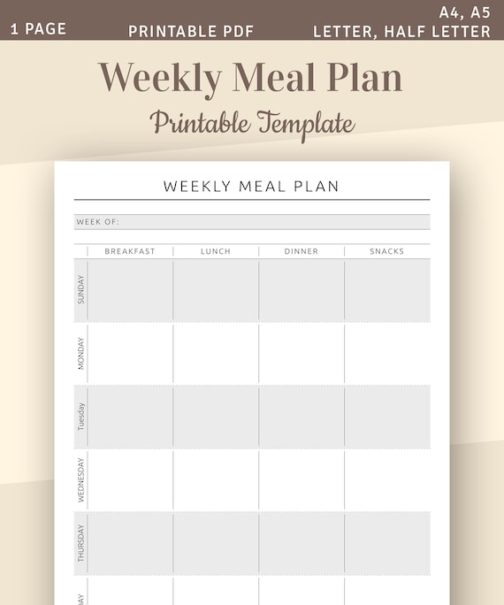 Weekly Meal Plan Printable Week Menu Planner Weekly Food Planner Template Family Meal Planning A4 A5 Letter Half Letter Pdf Insert